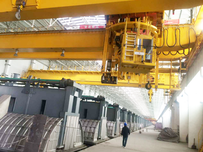 焙燒多功能天車主要有哪些用途?焙燒多功能天車主要安裝在炭素陽極焙燒車間,是作為焙燒爐生產與檢修用的多功能起重設備。它一般主要用來完成以下各項作業。 1、利用陽極夾具把鏈式輸送機上的生炭塊夾住,然后送往焙燒爐的爐坑,進行裝爐作業。2、利用吸料管從焙燒爐坑內吸取填充料,然后進行粉塵分級作業。3、利用補充吸料管進行煙道內的清掃工作以及粉塵的定期排除作業。4、利用起重電葫蘆進行焙燒爐的維護保養工作。 5、利用卸料管把料箱內的填充料添加到焙燒爐的爐坑內。6、利用陽極夾具把焙燒爐坑內的熟塊夾住,然后運往鏈式輸送機上,進行出爐作業。7、利用起重葫蘆進行燃燒器裝置的搬運作業。8、往料箱內填加新的填充料等等。以上就是焙燒多功能天車一些主要用途,總之是功能較多的一類起重設備,凱源起重專業生產優質焙燒多功能天車,性價比更高,歡迎大家咨詢。